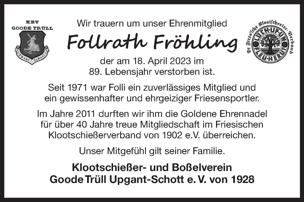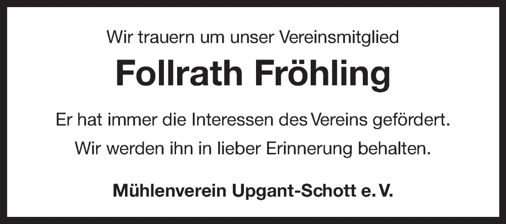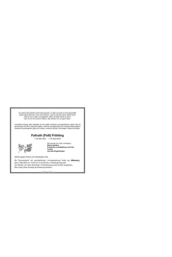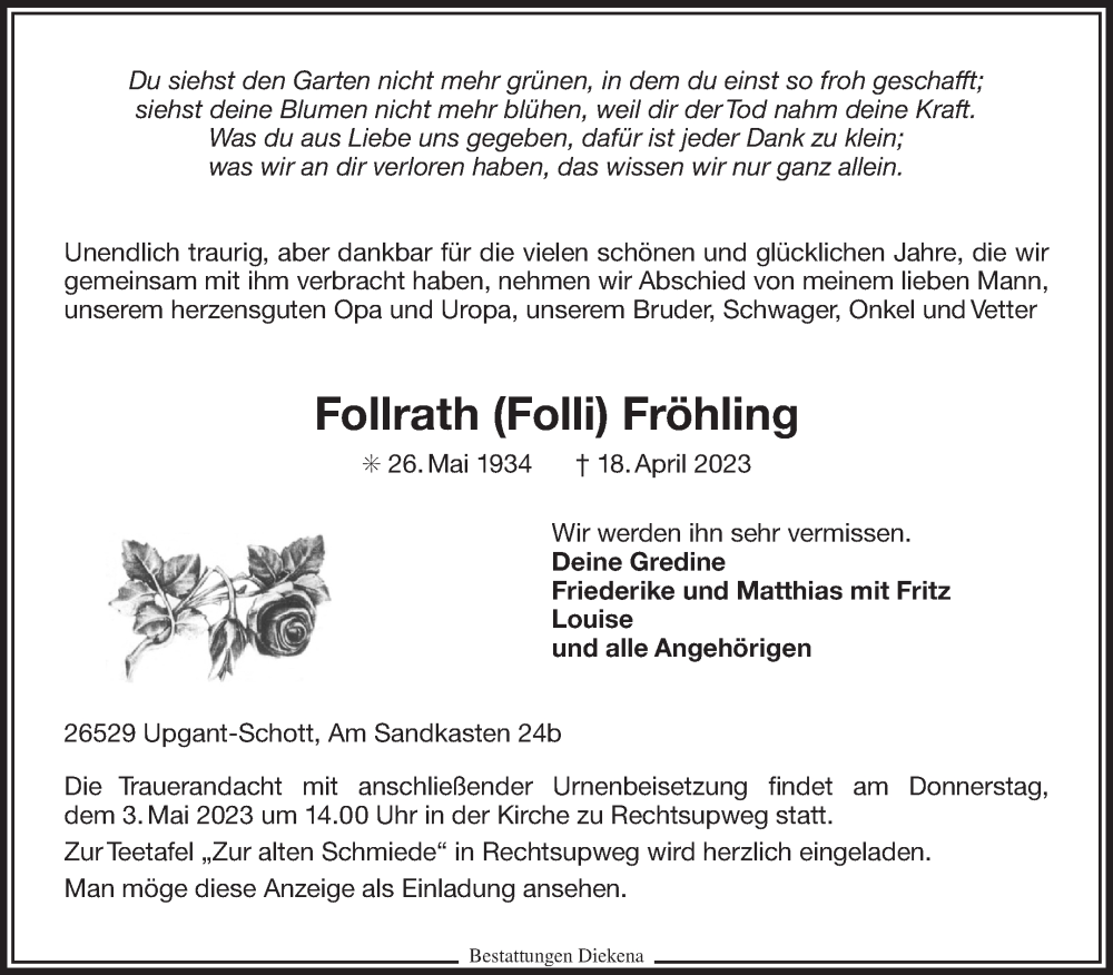Hier finden Sie alle Traueranzeigen aus der Zeitung, die bisher für Follrath Fröhling erschienen sind. Weitere Traueranzeigen, die in der Zeitung erscheinen, werden hier ebenfalls aufgelistet
