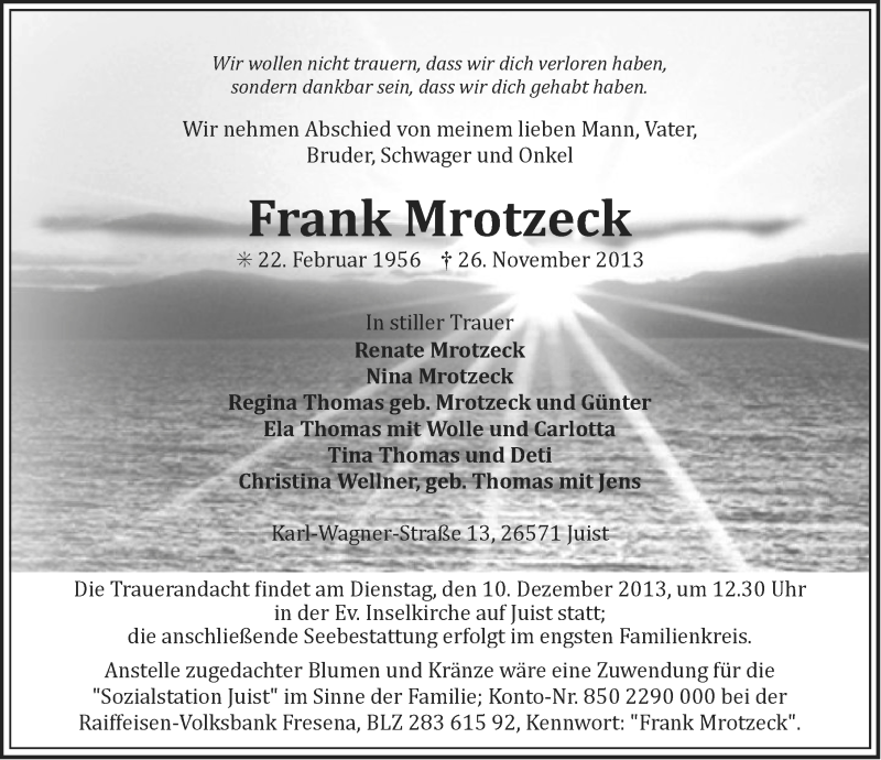Hier finden Sie alle Traueranzeigen aus der Zeitung, die bisher für Frank Mrotzeck erschienen sind. Weitere Traueranzeigen, die in der Zeitung erscheinen, werden hier ebenfalls aufgelistet