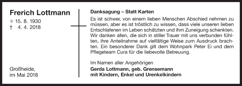 Hier finden Sie alle Traueranzeigen aus der Zeitung, die bisher für Frerich Lottmann erschienen sind. Weitere Traueranzeigen, die in der Zeitung erscheinen, werden hier ebenfalls aufgelistet