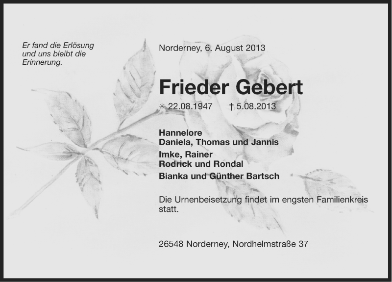 Hier finden Sie alle Traueranzeigen aus der Zeitung, die bisher für Frieder Gebert erschienen sind. Weitere Traueranzeigen, die in der Zeitung erscheinen, werden hier ebenfalls aufgelistet
