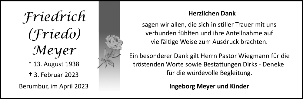 Hier finden Sie alle Traueranzeigen aus der Zeitung, die bisher für Friedrich Meyer erschienen sind. Weitere Traueranzeigen, die in der Zeitung erscheinen, werden hier ebenfalls aufgelistet
