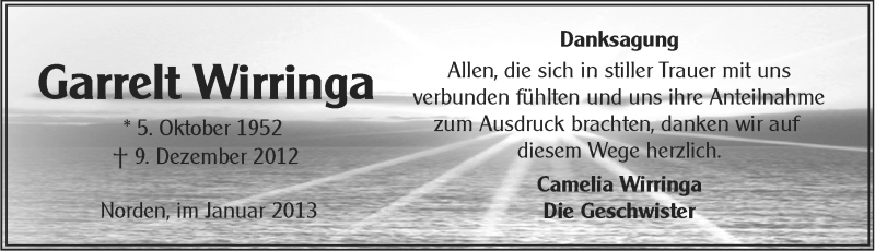 Hier finden Sie alle Traueranzeigen aus der Zeitung, die bisher für Garrelt Wirringa erschienen sind. Weitere Traueranzeigen, die in der Zeitung erscheinen, werden hier ebenfalls aufgelistet
