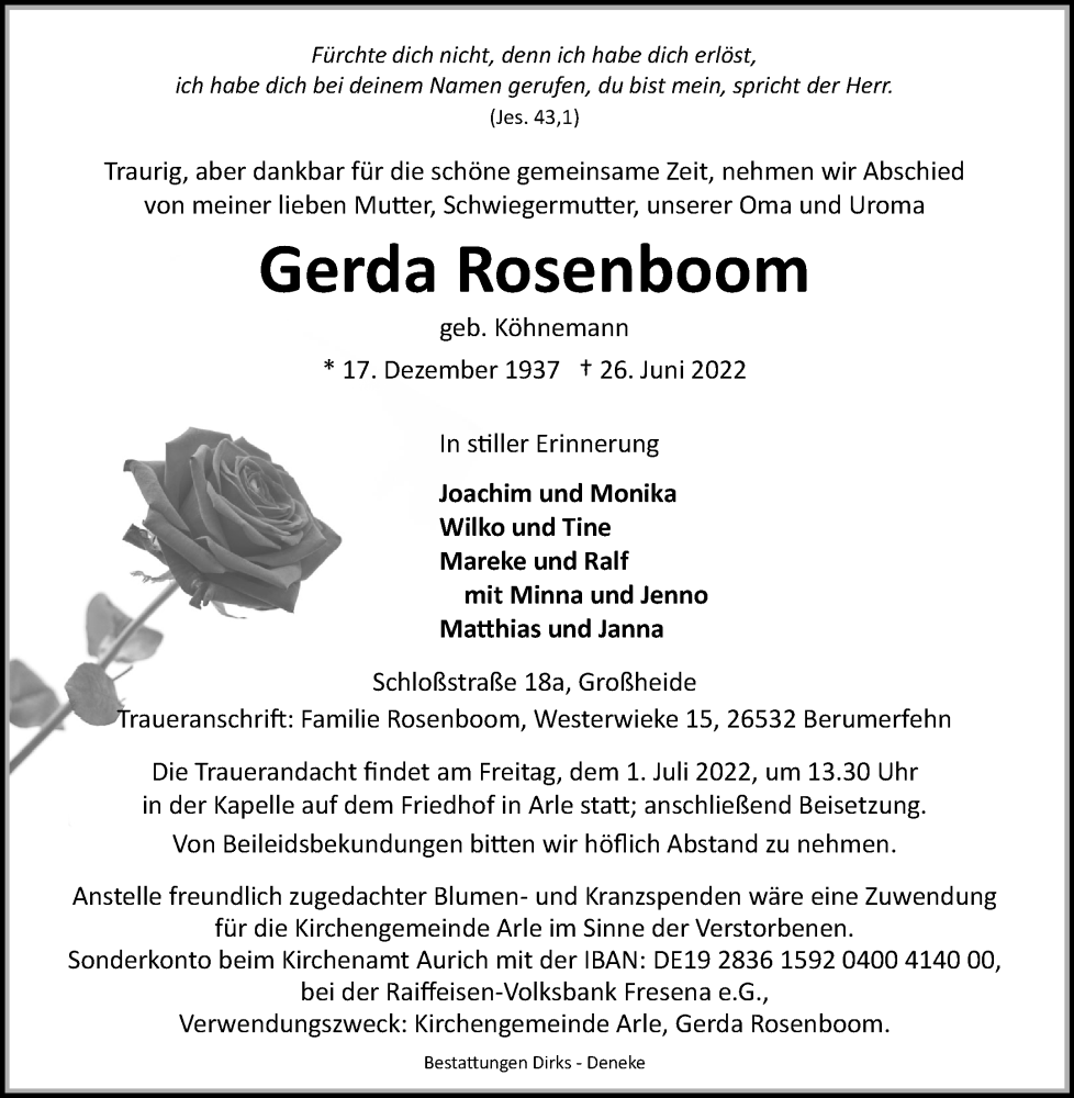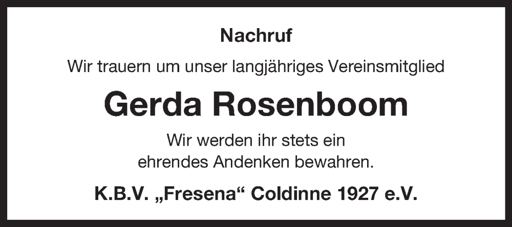 Hier finden Sie alle Traueranzeigen aus der Zeitung, die bisher für Gerda Rosenboom erschienen sind. Weitere Traueranzeigen, die in der Zeitung erscheinen, werden hier ebenfalls aufgelistet