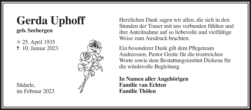 Hier finden Sie alle Traueranzeigen aus der Zeitung, die bisher für Gerda Uphoff erschienen sind. Weitere Traueranzeigen, die in der Zeitung erscheinen, werden hier ebenfalls aufgelistet