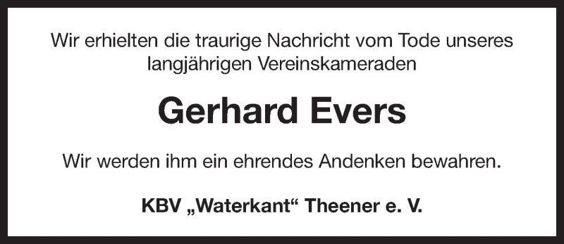 Hier finden Sie alle Traueranzeigen aus der Zeitung, die bisher für Gerhard Evers erschienen sind. Weitere Traueranzeigen, die in der Zeitung erscheinen, werden hier ebenfalls aufgelistet
