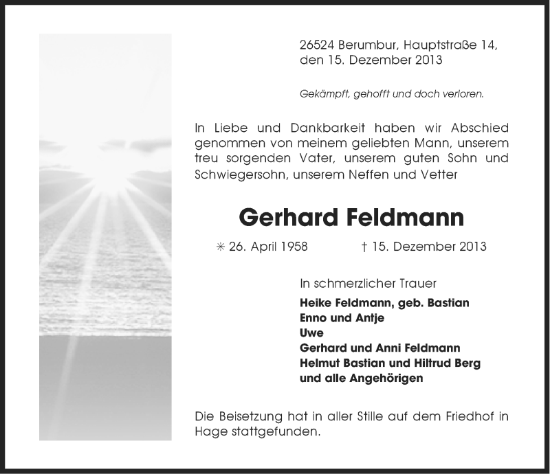 Hier finden Sie alle Traueranzeigen aus der Zeitung, die bisher für Gerhard Feldmann erschienen sind. Weitere Traueranzeigen, die in der Zeitung erscheinen, werden hier ebenfalls aufgelistet
