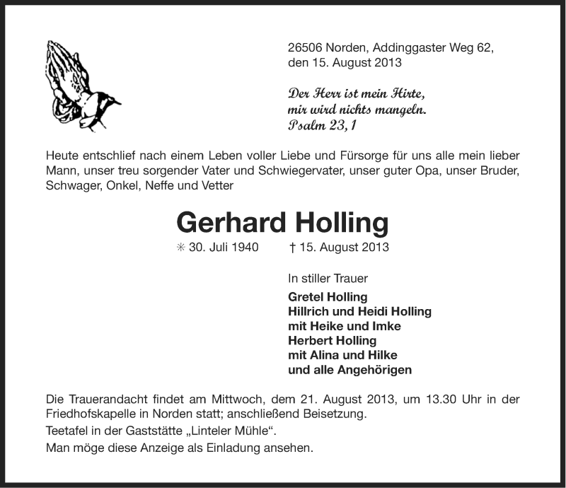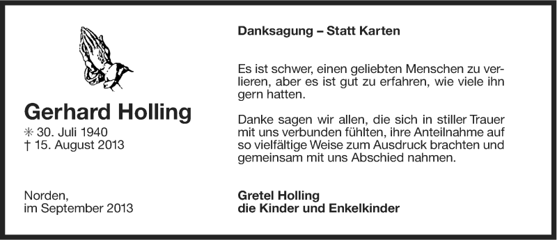 Hier finden Sie alle Traueranzeigen aus der Zeitung, die bisher für Gerhard Holling erschienen sind. Weitere Traueranzeigen, die in der Zeitung erscheinen, werden hier ebenfalls aufgelistet