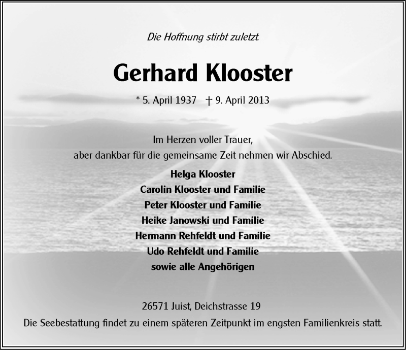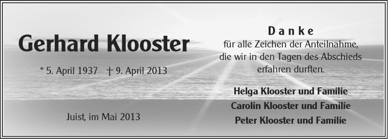 Hier finden Sie alle Traueranzeigen aus der Zeitung, die bisher für Gerhard Klooster erschienen sind. Weitere Traueranzeigen, die in der Zeitung erscheinen, werden hier ebenfalls aufgelistet
