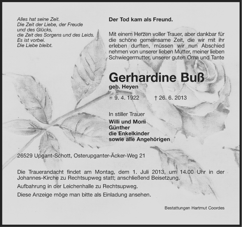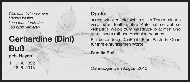 Hier finden Sie alle Traueranzeigen aus der Zeitung, die bisher für Gerhardine Buß erschienen sind. Weitere Traueranzeigen, die in der Zeitung erscheinen, werden hier ebenfalls aufgelistet
