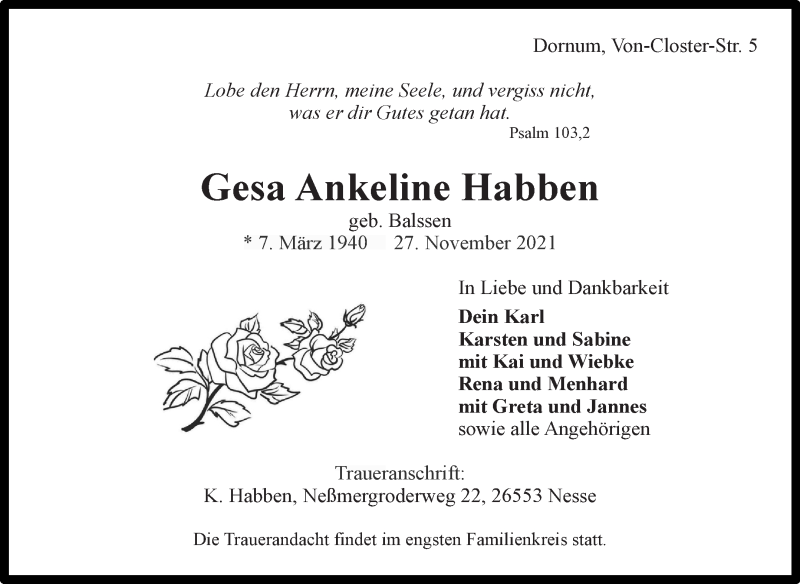 Hier finden Sie alle Traueranzeigen aus der Zeitung, die bisher für Gesa Ankeline Habben erschienen sind. Weitere Traueranzeigen, die in der Zeitung erscheinen, werden hier ebenfalls aufgelistet