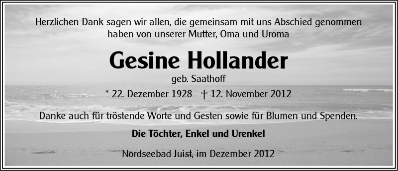 Hier finden Sie alle Traueranzeigen aus der Zeitung, die bisher für Gesine Hollander erschienen sind. Weitere Traueranzeigen, die in der Zeitung erscheinen, werden hier ebenfalls aufgelistet