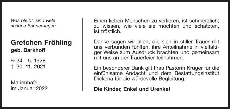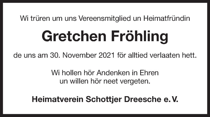Hier finden Sie alle Traueranzeigen aus der Zeitung, die bisher für Gretchen Fröhling erschienen sind. Weitere Traueranzeigen, die in der Zeitung erscheinen, werden hier ebenfalls aufgelistet