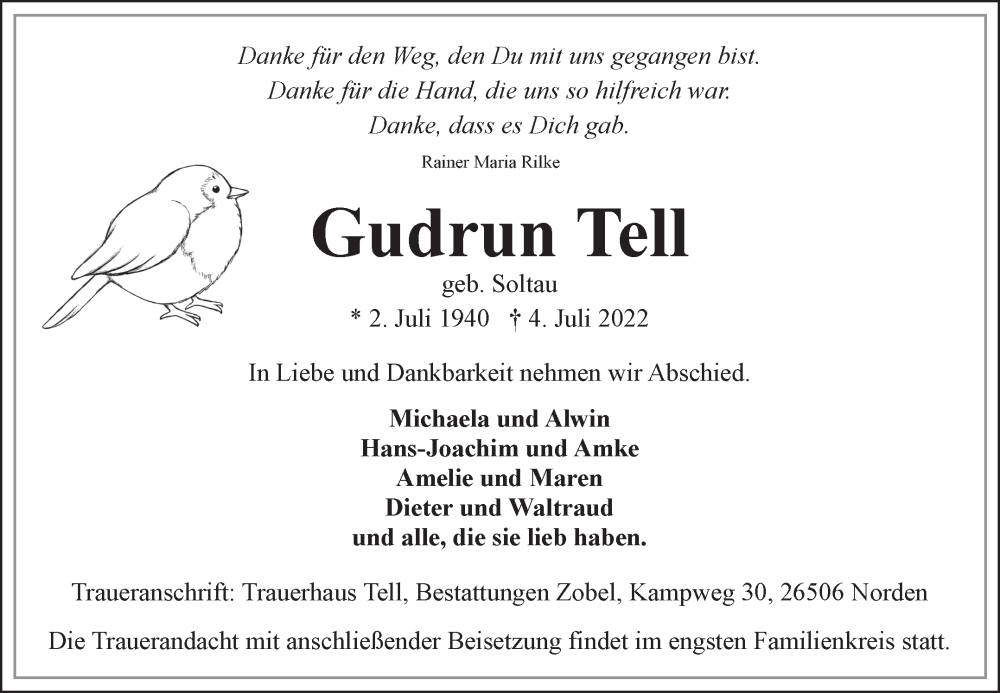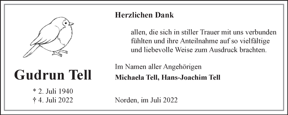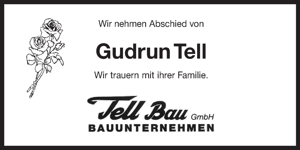 Hier finden Sie alle Traueranzeigen aus der Zeitung, die bisher für Gudrun Tell erschienen sind. Weitere Traueranzeigen, die in der Zeitung erscheinen, werden hier ebenfalls aufgelistet