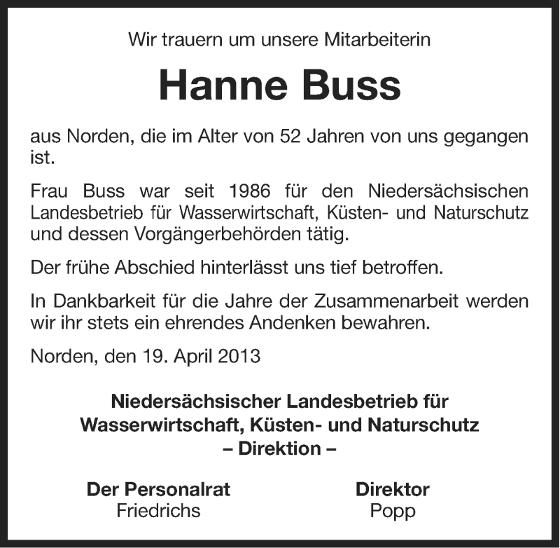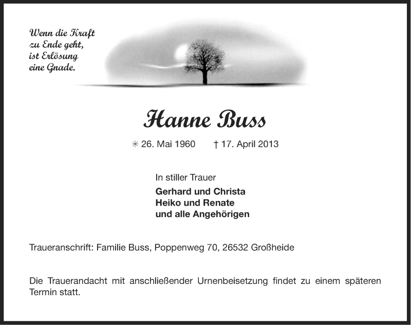 Hier finden Sie alle Traueranzeigen aus der Zeitung, die bisher für Hanne Buss erschienen sind. Weitere Traueranzeigen, die in der Zeitung erscheinen, werden hier ebenfalls aufgelistet