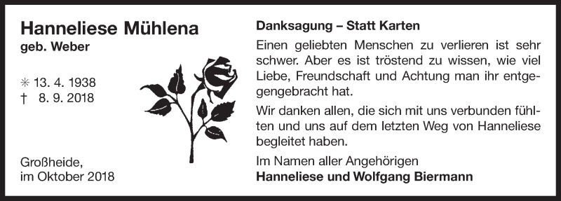 Hier finden Sie alle Traueranzeigen aus der Zeitung, die bisher für Hanneliese Mühlena erschienen sind. Weitere Traueranzeigen, die in der Zeitung erscheinen, werden hier ebenfalls aufgelistet