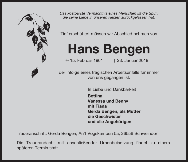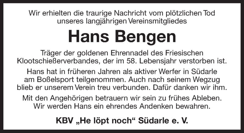 Hier finden Sie alle Traueranzeigen aus der Zeitung, die bisher für Hans Bengen erschienen sind. Weitere Traueranzeigen, die in der Zeitung erscheinen, werden hier ebenfalls aufgelistet