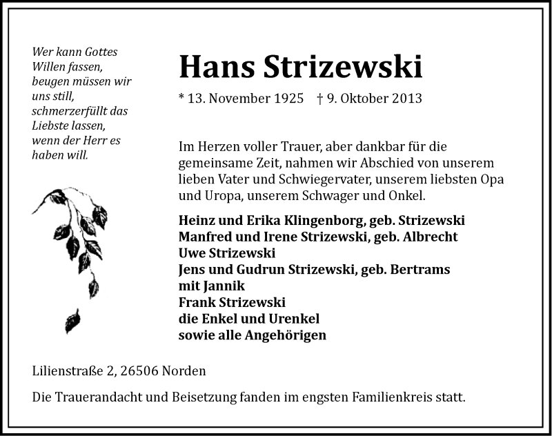 Hier finden Sie alle Traueranzeigen aus der Zeitung, die bisher für Hans Strizewski erschienen sind. Weitere Traueranzeigen, die in der Zeitung erscheinen, werden hier ebenfalls aufgelistet