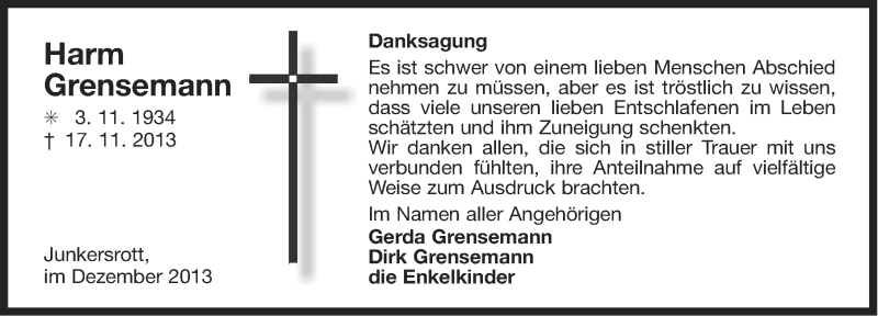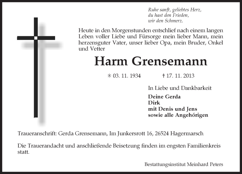 Hier finden Sie alle Traueranzeigen aus der Zeitung, die bisher für Harm Grensemann erschienen sind. Weitere Traueranzeigen, die in der Zeitung erscheinen, werden hier ebenfalls aufgelistet