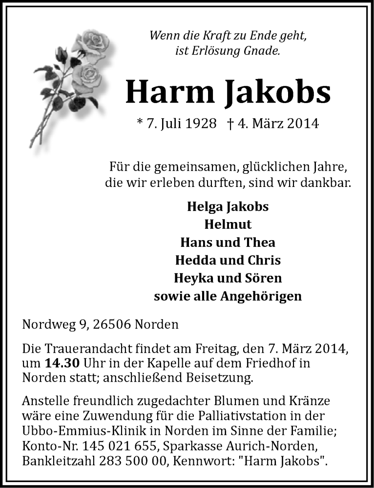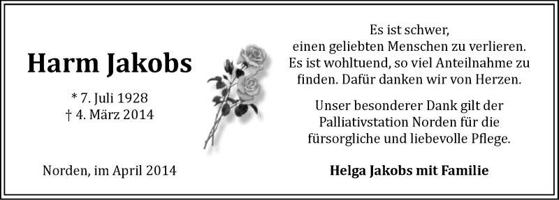 Hier finden Sie alle Traueranzeigen aus der Zeitung, die bisher für Harm Jakobs erschienen sind. Weitere Traueranzeigen, die in der Zeitung erscheinen, werden hier ebenfalls aufgelistet