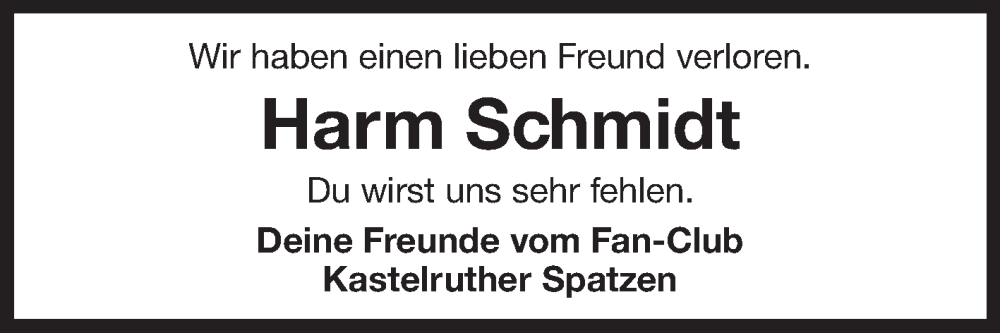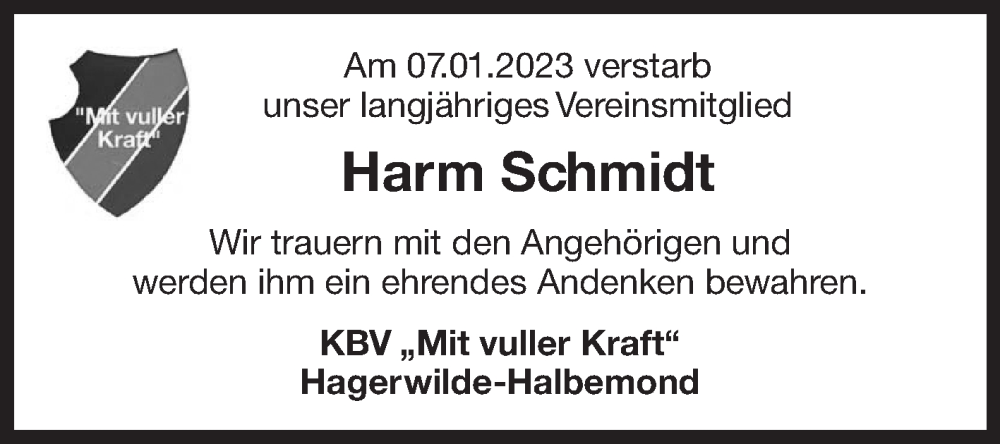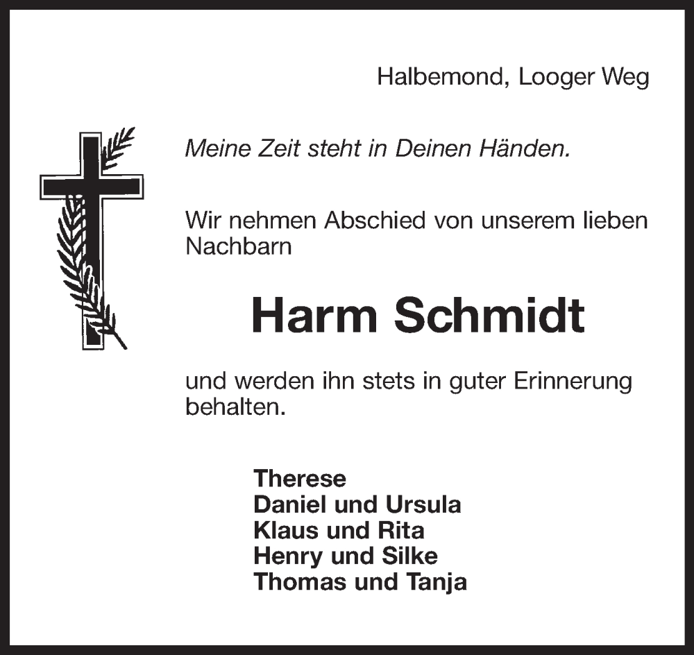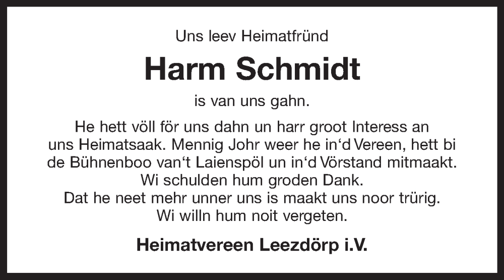 Hier finden Sie alle Traueranzeigen aus der Zeitung, die bisher für Harm Schmidt erschienen sind. Weitere Traueranzeigen, die in der Zeitung erscheinen, werden hier ebenfalls aufgelistet