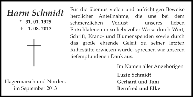 Hier finden Sie alle Traueranzeigen aus der Zeitung, die bisher für Harm Schmidt erschienen sind. Weitere Traueranzeigen, die in der Zeitung erscheinen, werden hier ebenfalls aufgelistet