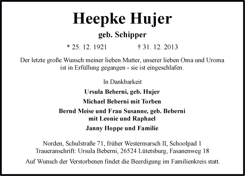 Hier finden Sie alle Traueranzeigen aus der Zeitung, die bisher für Heepke Hujer erschienen sind. Weitere Traueranzeigen, die in der Zeitung erscheinen, werden hier ebenfalls aufgelistet