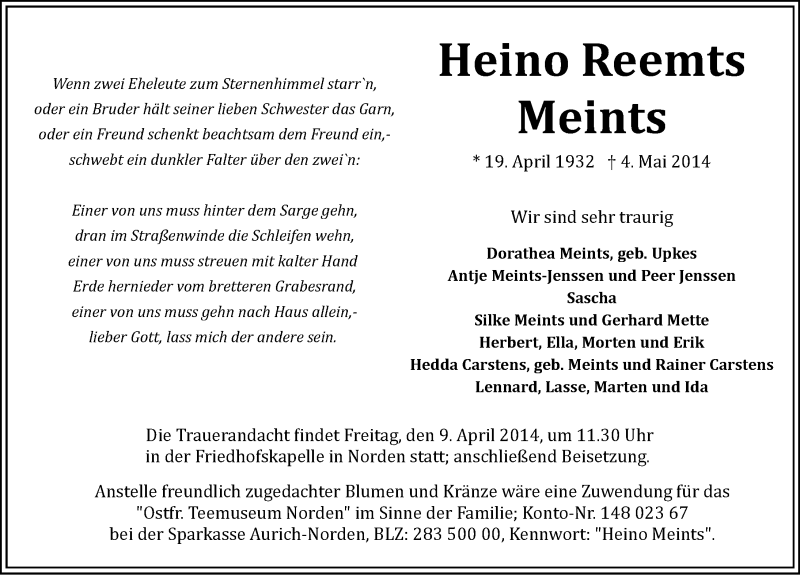 Hier finden Sie alle Traueranzeigen aus der Zeitung, die bisher für Heino Reemts Meints erschienen sind. Weitere Traueranzeigen, die in der Zeitung erscheinen, werden hier ebenfalls aufgelistet
