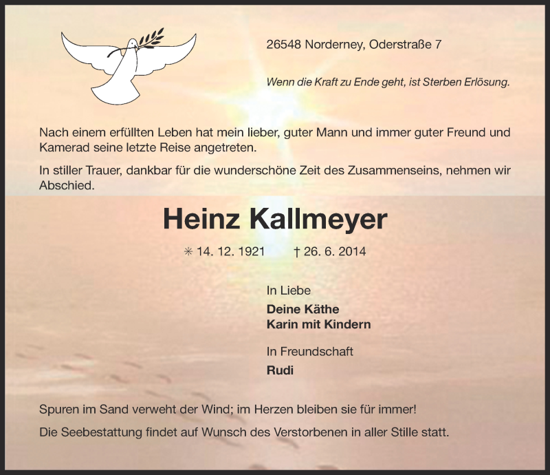 Hier finden Sie alle Traueranzeigen aus der Zeitung, die bisher für Heinz Kallmeyer erschienen sind. Weitere Traueranzeigen, die in der Zeitung erscheinen, werden hier ebenfalls aufgelistet