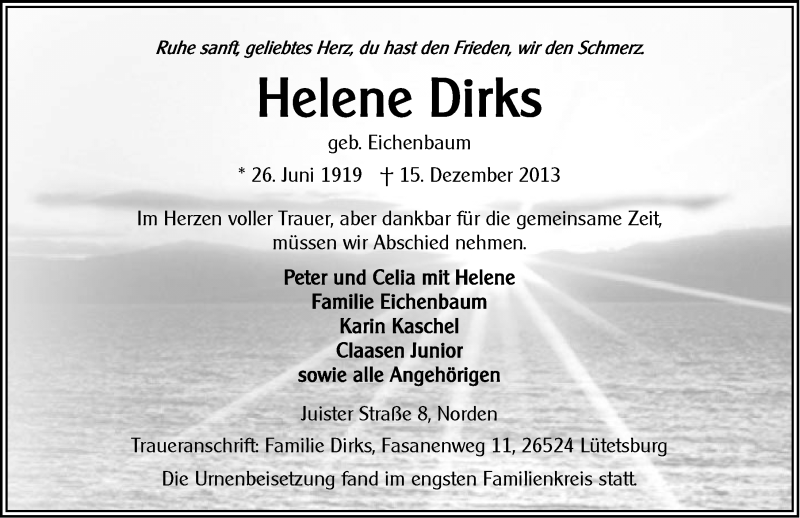 Hier finden Sie alle Traueranzeigen aus der Zeitung, die bisher für Helene Dirks erschienen sind. Weitere Traueranzeigen, die in der Zeitung erscheinen, werden hier ebenfalls aufgelistet