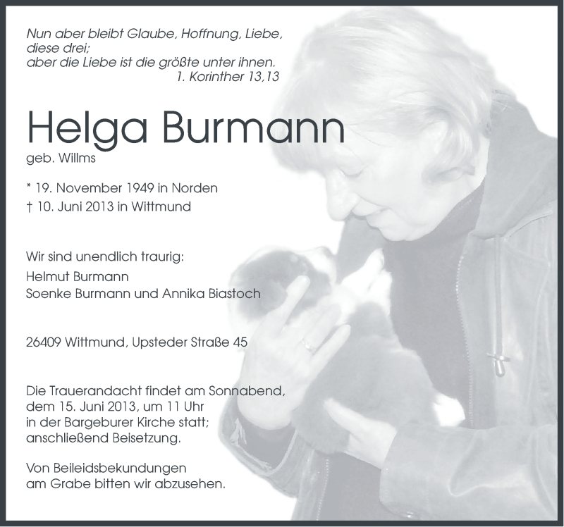 Hier finden Sie alle Traueranzeigen aus der Zeitung, die bisher für Helga Burmann erschienen sind. Weitere Traueranzeigen, die in der Zeitung erscheinen, werden hier ebenfalls aufgelistet