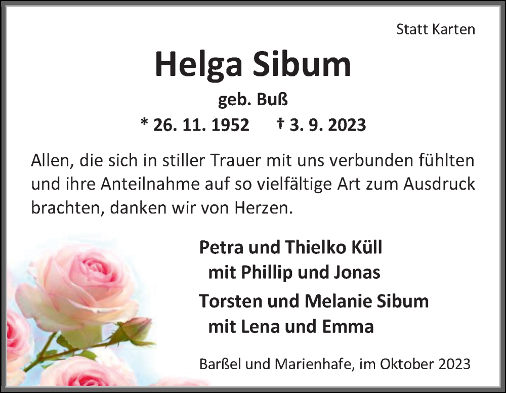 Hier finden Sie alle Traueranzeigen aus der Zeitung, die bisher für Helga Sibum erschienen sind. Weitere Traueranzeigen, die in der Zeitung erscheinen, werden hier ebenfalls aufgelistet