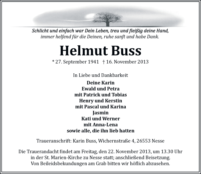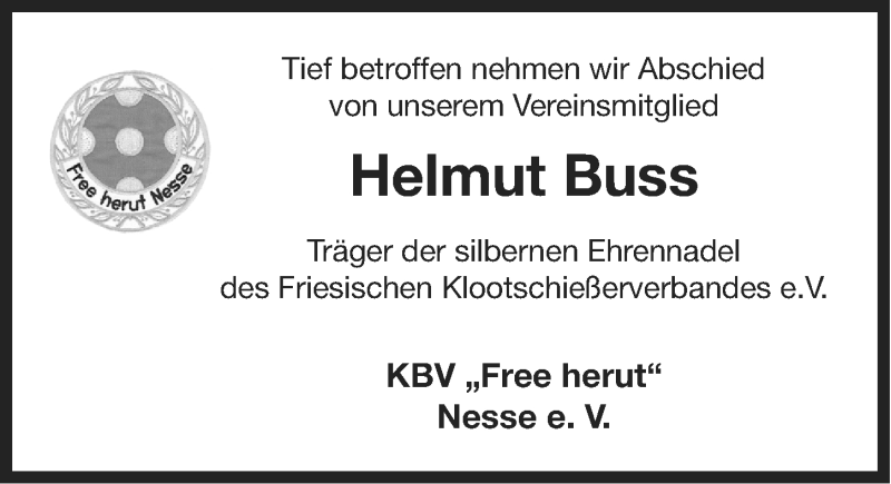 Hier finden Sie alle Traueranzeigen aus der Zeitung, die bisher für Helmut Buss erschienen sind. Weitere Traueranzeigen, die in der Zeitung erscheinen, werden hier ebenfalls aufgelistet