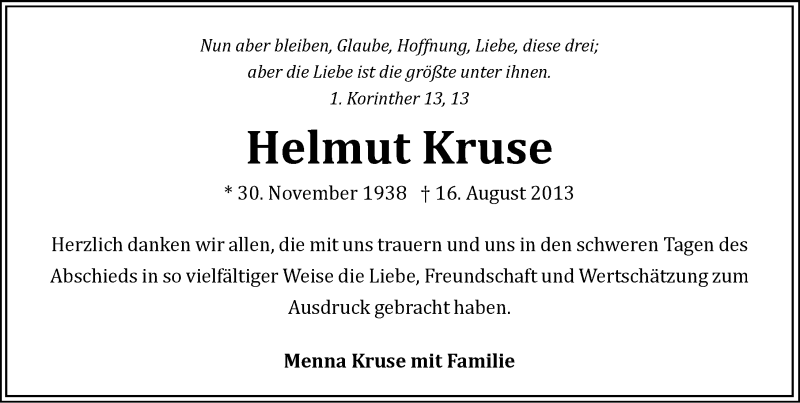 Hier finden Sie alle Traueranzeigen aus der Zeitung, die bisher für Helmut Kruse erschienen sind. Weitere Traueranzeigen, die in der Zeitung erscheinen, werden hier ebenfalls aufgelistet