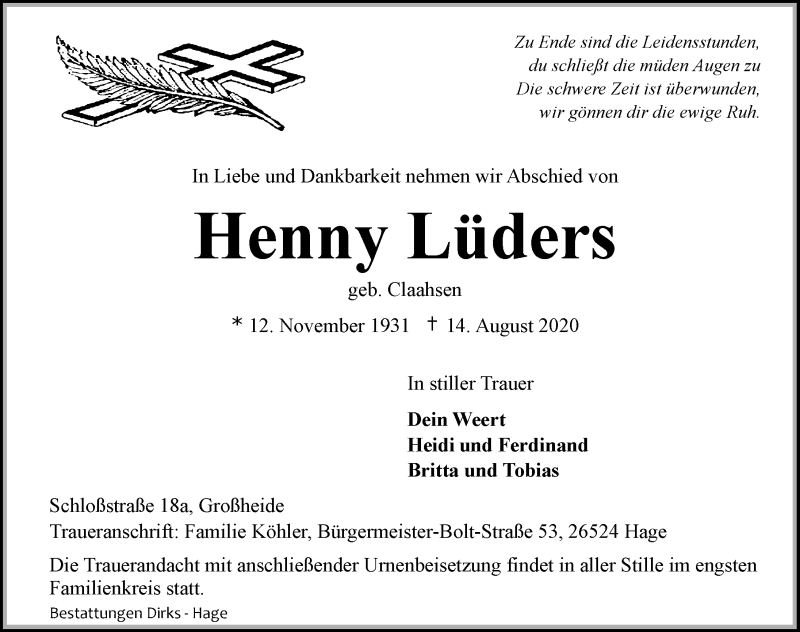 Hier finden Sie alle Traueranzeigen aus der Zeitung, die bisher für Henny Lüders erschienen sind. Weitere Traueranzeigen, die in der Zeitung erscheinen, werden hier ebenfalls aufgelistet
