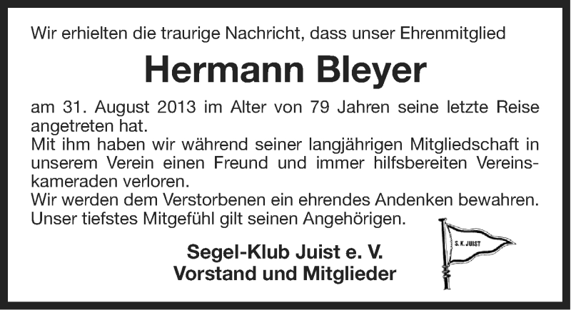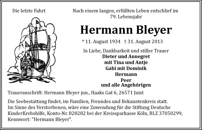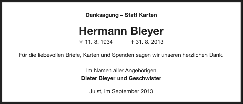 Hier finden Sie alle Traueranzeigen aus der Zeitung, die bisher für Hermann Bleyer erschienen sind. Weitere Traueranzeigen, die in der Zeitung erscheinen, werden hier ebenfalls aufgelistet