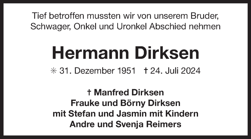 Hier finden Sie alle Traueranzeigen aus der Zeitung, die bisher für Hermann Dirksen erschienen sind. Weitere Traueranzeigen, die in der Zeitung erscheinen, werden hier ebenfalls aufgelistet