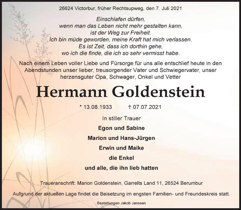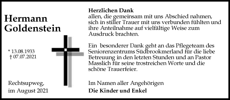 Hier finden Sie alle Traueranzeigen aus der Zeitung, die bisher für Hermann Goldenstein erschienen sind. Weitere Traueranzeigen, die in der Zeitung erscheinen, werden hier ebenfalls aufgelistet