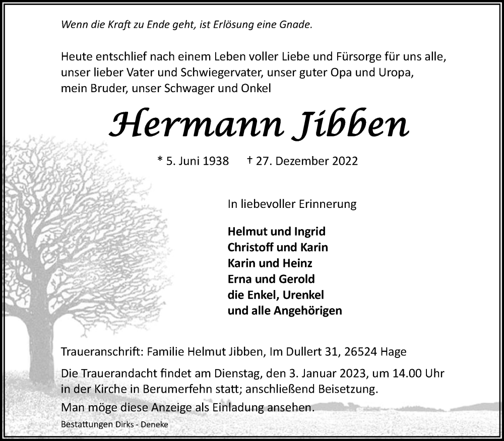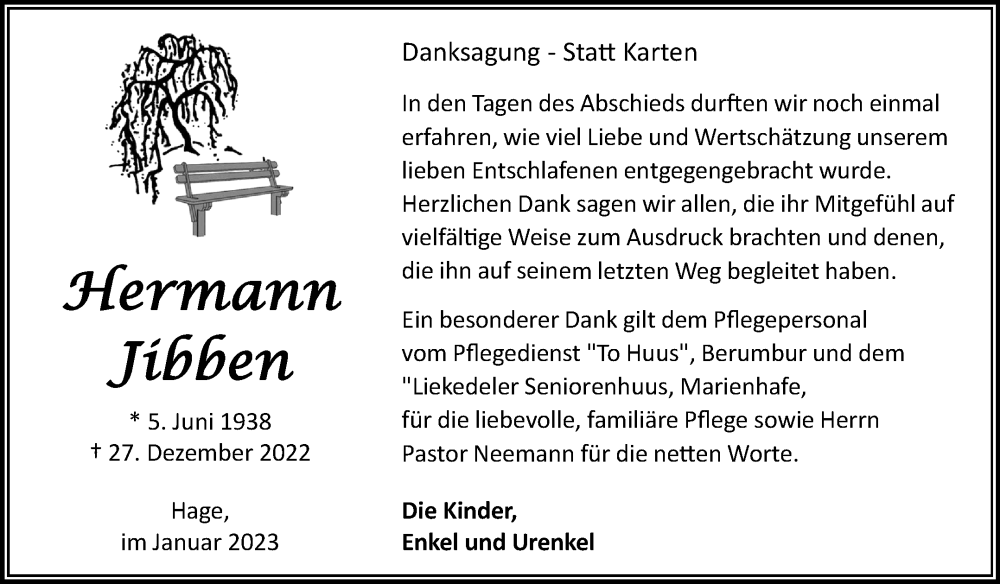 Hier finden Sie alle Traueranzeigen aus der Zeitung, die bisher für Hermann Jibben erschienen sind. Weitere Traueranzeigen, die in der Zeitung erscheinen, werden hier ebenfalls aufgelistet