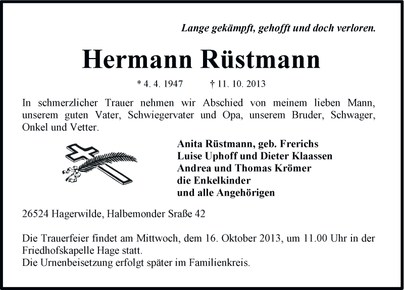 Hier finden Sie alle Traueranzeigen aus der Zeitung, die bisher für Hermann Rüstmann erschienen sind. Weitere Traueranzeigen, die in der Zeitung erscheinen, werden hier ebenfalls aufgelistet