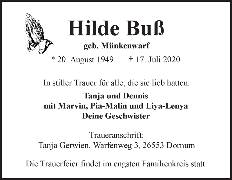 Hier finden Sie alle Traueranzeigen aus der Zeitung, die bisher für Hilde Buß erschienen sind. Weitere Traueranzeigen, die in der Zeitung erscheinen, werden hier ebenfalls aufgelistet