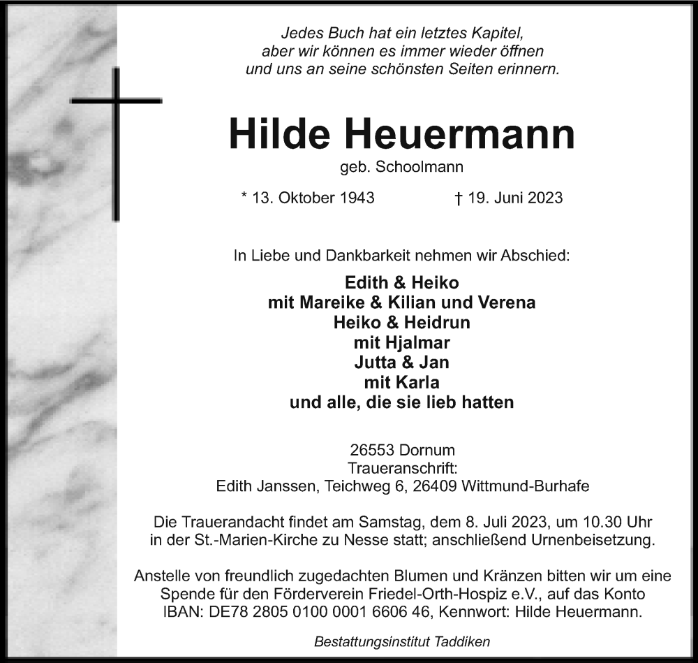 Hier finden Sie alle Traueranzeigen aus der Zeitung, die bisher für Hilde Heuermann erschienen sind. Weitere Traueranzeigen, die in der Zeitung erscheinen, werden hier ebenfalls aufgelistet
