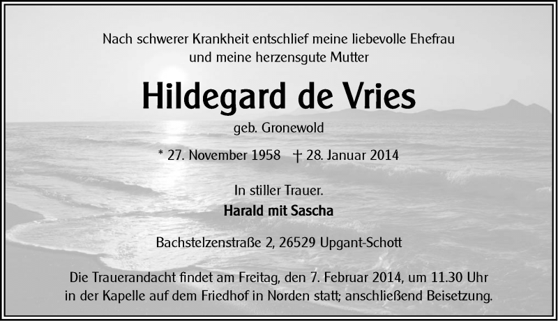 Hier finden Sie alle Traueranzeigen aus der Zeitung, die bisher für Hildegard de Vries erschienen sind. Weitere Traueranzeigen, die in der Zeitung erscheinen, werden hier ebenfalls aufgelistet