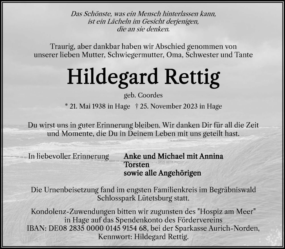 Hier finden Sie alle Traueranzeigen aus der Zeitung, die bisher für Hildegard Rettig erschienen sind. Weitere Traueranzeigen, die in der Zeitung erscheinen, werden hier ebenfalls aufgelistet