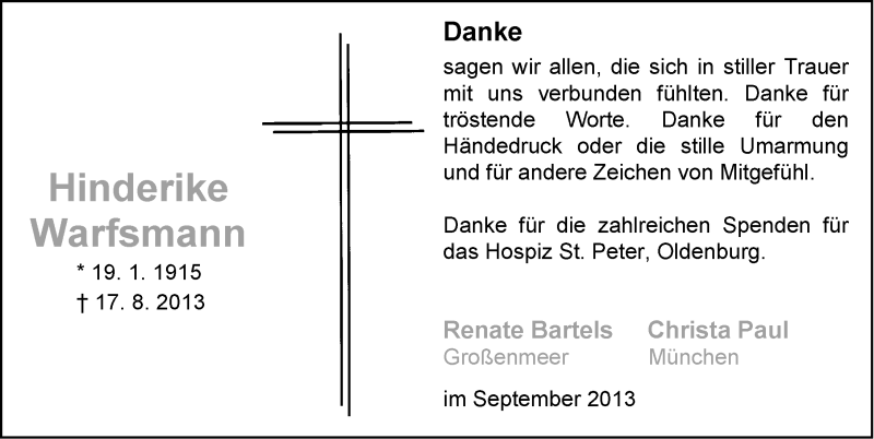 Hier finden Sie alle Traueranzeigen aus der Zeitung, die bisher für Hinderike Warfsmann erschienen sind. Weitere Traueranzeigen, die in der Zeitung erscheinen, werden hier ebenfalls aufgelistet