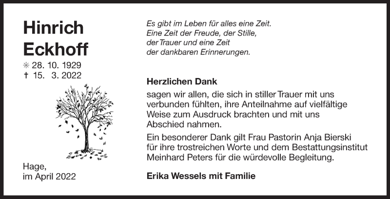 Hier finden Sie alle Traueranzeigen aus der Zeitung, die bisher für Hinrich Eckhoff erschienen sind. Weitere Traueranzeigen, die in der Zeitung erscheinen, werden hier ebenfalls aufgelistet