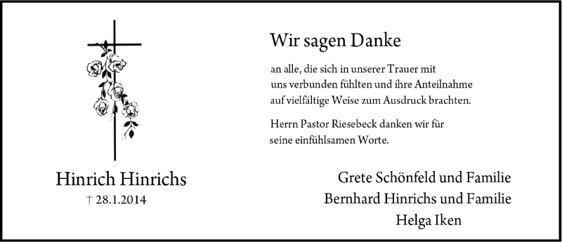 Hier finden Sie alle Traueranzeigen aus der Zeitung, die bisher für Hinrich Hinrichs erschienen sind. Weitere Traueranzeigen, die in der Zeitung erscheinen, werden hier ebenfalls aufgelistet