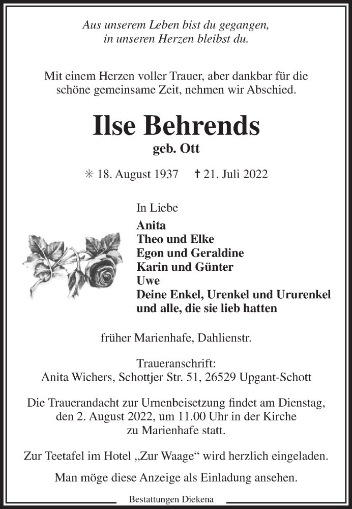 Hier finden Sie alle Traueranzeigen aus der Zeitung, die bisher für Ilse Behrends erschienen sind. Weitere Traueranzeigen, die in der Zeitung erscheinen, werden hier ebenfalls aufgelistet