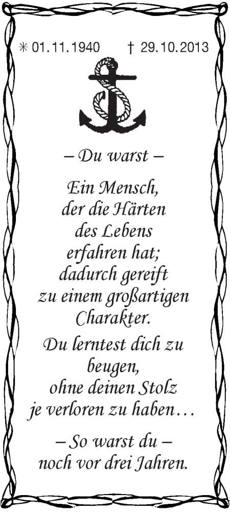 Hier finden Sie alle Traueranzeigen aus der Zeitung, die bisher für In Gedenken erschienen sind. Weitere Traueranzeigen, die in der Zeitung erscheinen, werden hier ebenfalls aufgelistet