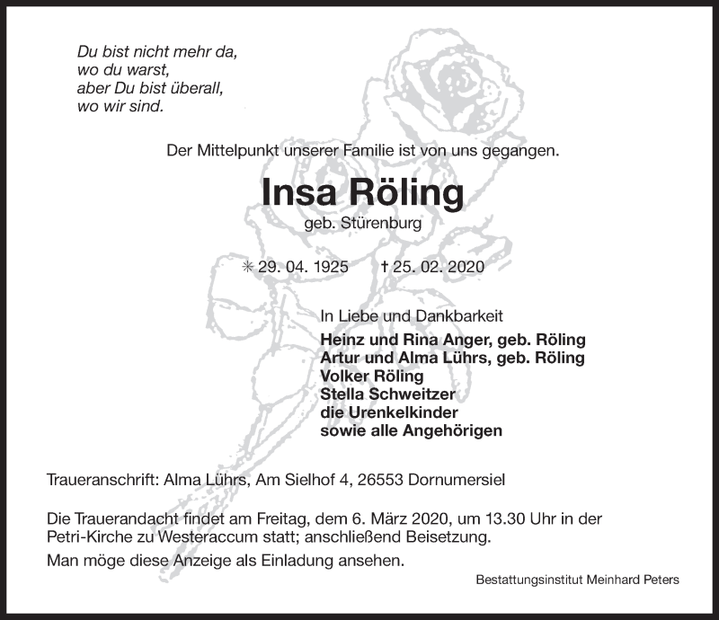 Hier finden Sie alle Traueranzeigen aus der Zeitung, die bisher für Insa Röling erschienen sind. Weitere Traueranzeigen, die in der Zeitung erscheinen, werden hier ebenfalls aufgelistet