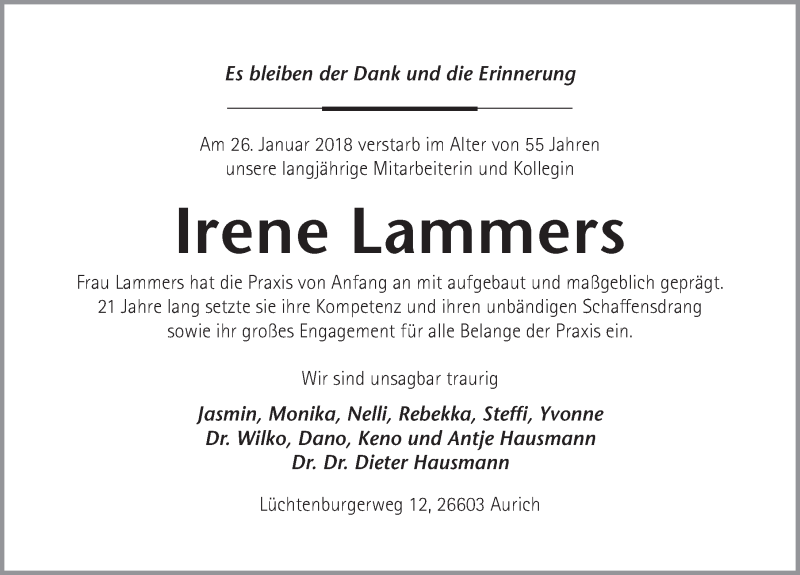 Hier finden Sie alle Traueranzeigen aus der Zeitung, die bisher für Irene Lammers erschienen sind. Weitere Traueranzeigen, die in der Zeitung erscheinen, werden hier ebenfalls aufgelistet